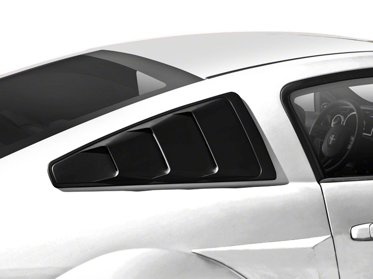 Recommended Styling Upgrade. When installing exterior quarter window louvers or scoops on your Mustang it is recommended to add a set of quarter window blackout decals to hide the ugly back side that wasn't meant to be seen by human eyes. Available for 2005-2009 and 2010-2014 Mustangs, see drop down option above.