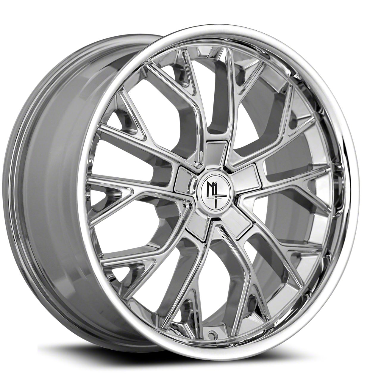 Modern Luxury MLF15 Chrome Wheel; 22x8.5; 38mm Offset This wheel features sophisticated styling that enhances your vehicle's appearance with refined design elements and premium craftsmanship. Its distinctive aesthetic provides an upgraded look that complements a wide range of vehicles. The thoughtful engineering ensures a proper fit while delivering lasting visual appeal.