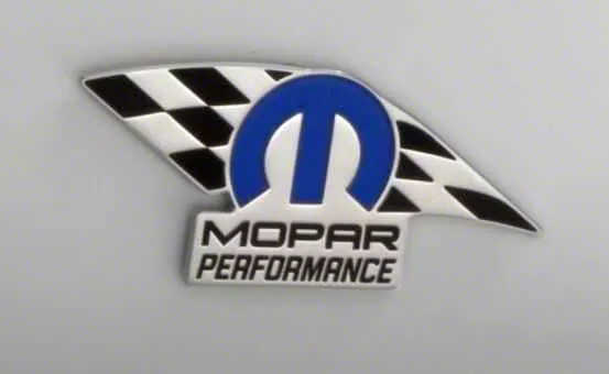 Super Customization. Show your Mopar pride with the Mopar Performance Emblem. This hard chrome plated performance emblem features the unique Mopar logo with 'Mopar Performance' in large block style, along with the checkered flag as a back.