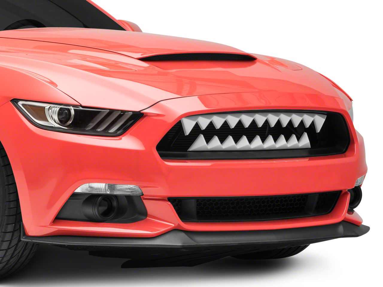 Intimidating Styling. For a unique look that will definitely get you noticed on the street and at car shows you will want to install this Shark Bite Grille for your 2015-2017 Mustang. Inspired by the iconic Shark Mouth nose-art found on fighter planes of the World War II era, this Shark Bite Grille will give your modern day street fighter an intimidating appearance.