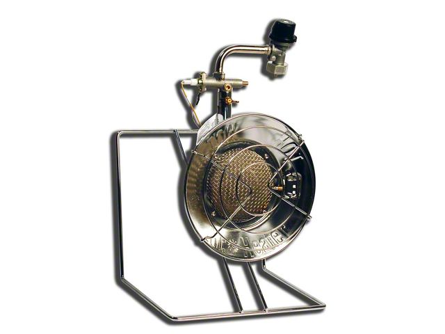 Description. Mr. Heater is the Original Tank Top heater. Assembled in Cleveland, Ohio, this radiant 10,000 - 15,000 BTU Liquid Propane Tank Top heater-cooker is the perfect solution for heating or cooking when out of doors. This heater is constructed with high quality chrome and stainless steel components to bring you reliable heating for warmth or cooking when on the go. With its adjustable high-medium-low regulator and integrated stand, this unit is easy to use with refillable or disposable gas cylinders.