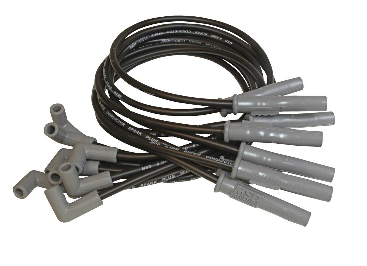 Super Conductor Wires. Upgrade to these MSD Super Conductor 8.50 mm Black Spark Plug Wires for a more powerful combustion in your Mustang’s engine. This set of 8 spark plug wires are exceptionally designed with low resistance to efficiently transfer electricity to the spark plugs. With less than 50 ohms per foot resistance and high EMI suppression, these wires ensure that maximum spark energy reaches the spark plugs for an improved combustion that gives your Mustang a remarkable performance boost.