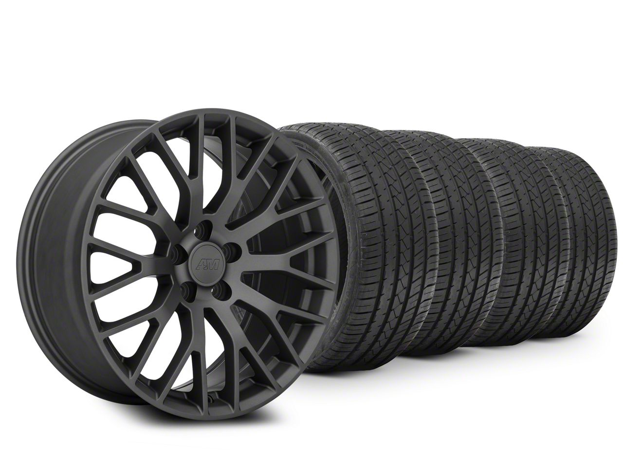 Charcoal Performance Pack Style Wheel. This Performance Pack Style Replica Wheel features a split multi-spoke mesh design that extends to the outer lip to exaggerate its over all size. This Wheel is completed in a high quality, clear coated, charcoal finish for an aggressive appearance that can withstand the hazards of everyday driving - including road chips and pitting.