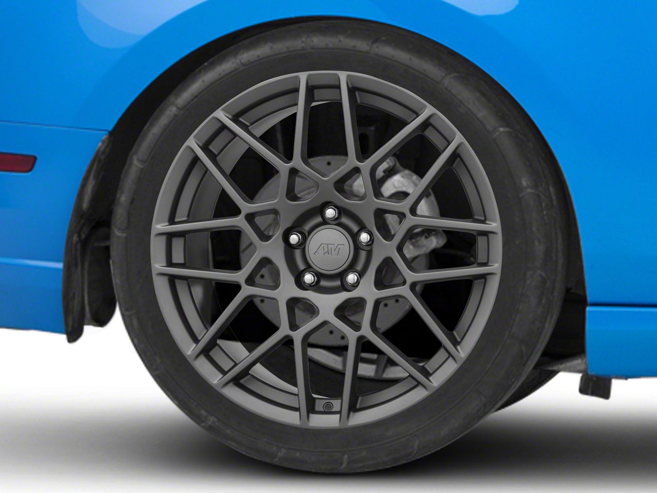 The 20x10 American Muscle Wheels 2013 GT500 Style Charcoal Wheel; Rear Only; 20x10 is completed in a dark charcoal hue that is lighter than the standard "Henry Ford" black, this wheel features a durable matte clear-coated finish for a stealthy appearance.