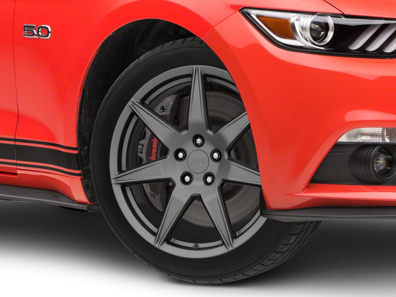 The 19x8.5 American Muscle Wheels 2020 GT500 Style Charcoal Wheel is completed in a dark charcoal hue that is lighter than the standard "Henry Ford" black, this wheel features a durable matte clear-coated finish for a stealthy appearance that is tough.