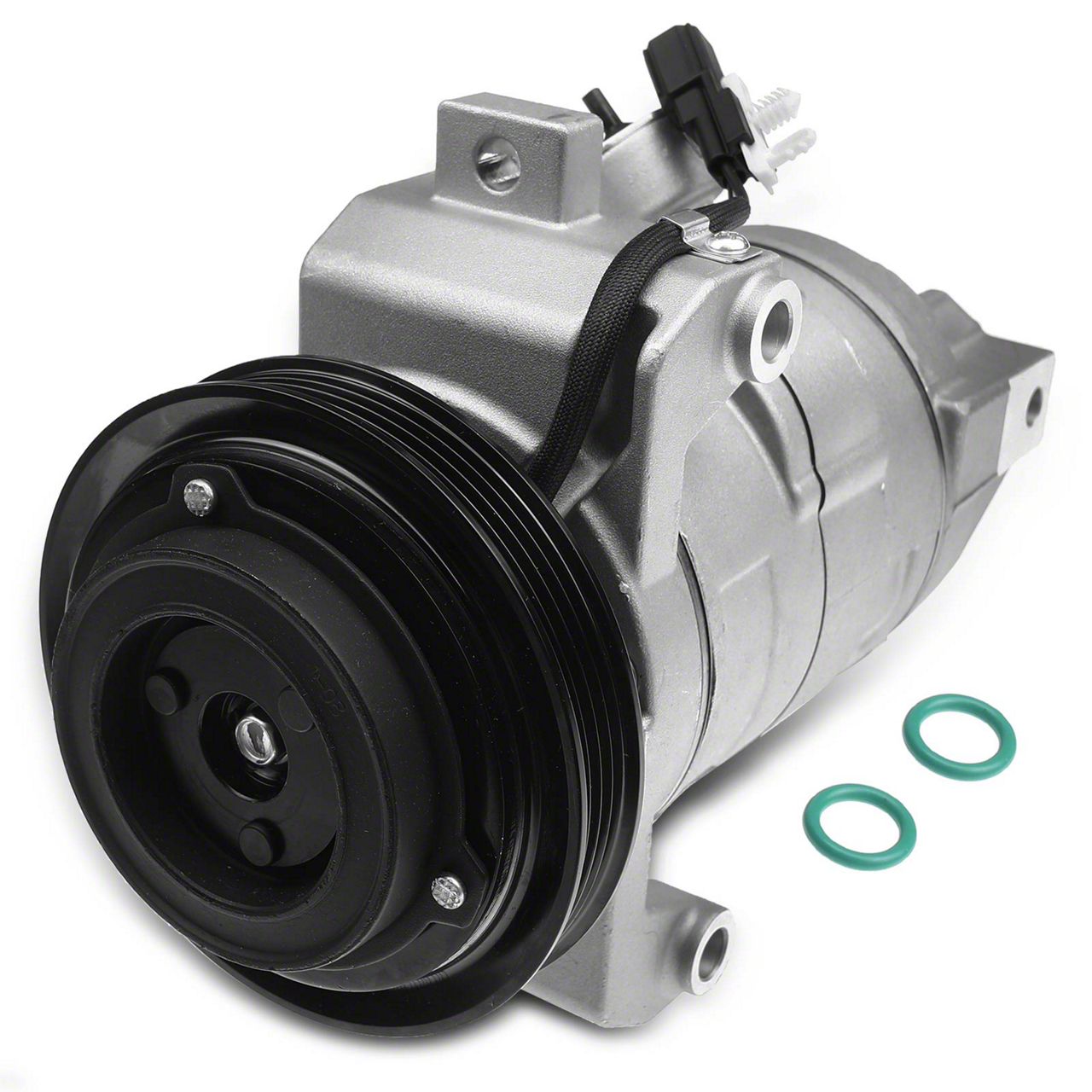 Premium Aftermarket Compressor. The A/C Compressor with Clutch and Pulley (11-14 Mustang V6) is a vital component of the vehicle's HVAC system, responsible for compressing and circulating refrigerant to provide effective air conditioning cooling. It enhances system performance by maintaining optimal pressure levels, ensuring cabin comfort in various environmental conditions.