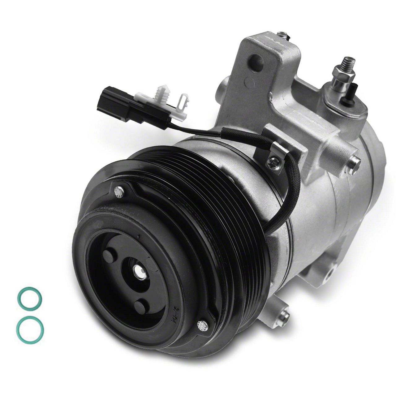 Construction and Appearance. Finished in a combination of matte black and raw metal, this compressor is built to OE compatible and comparable standards for fit, durability, and performance. The aluminum construction supports efficient heat dissipation and long service life, while the included clutch and pulley ensure proper engagement and smooth operation. Equipped with a 6-groove 4.5-inch pulley, the design maintains correct belt alignment and drive performance. The unit is engineered for use with PAG 100 oil and R134a refrigerant, supporting proper lubrication, pressure control, and long-term reliability within the air conditioning system.
