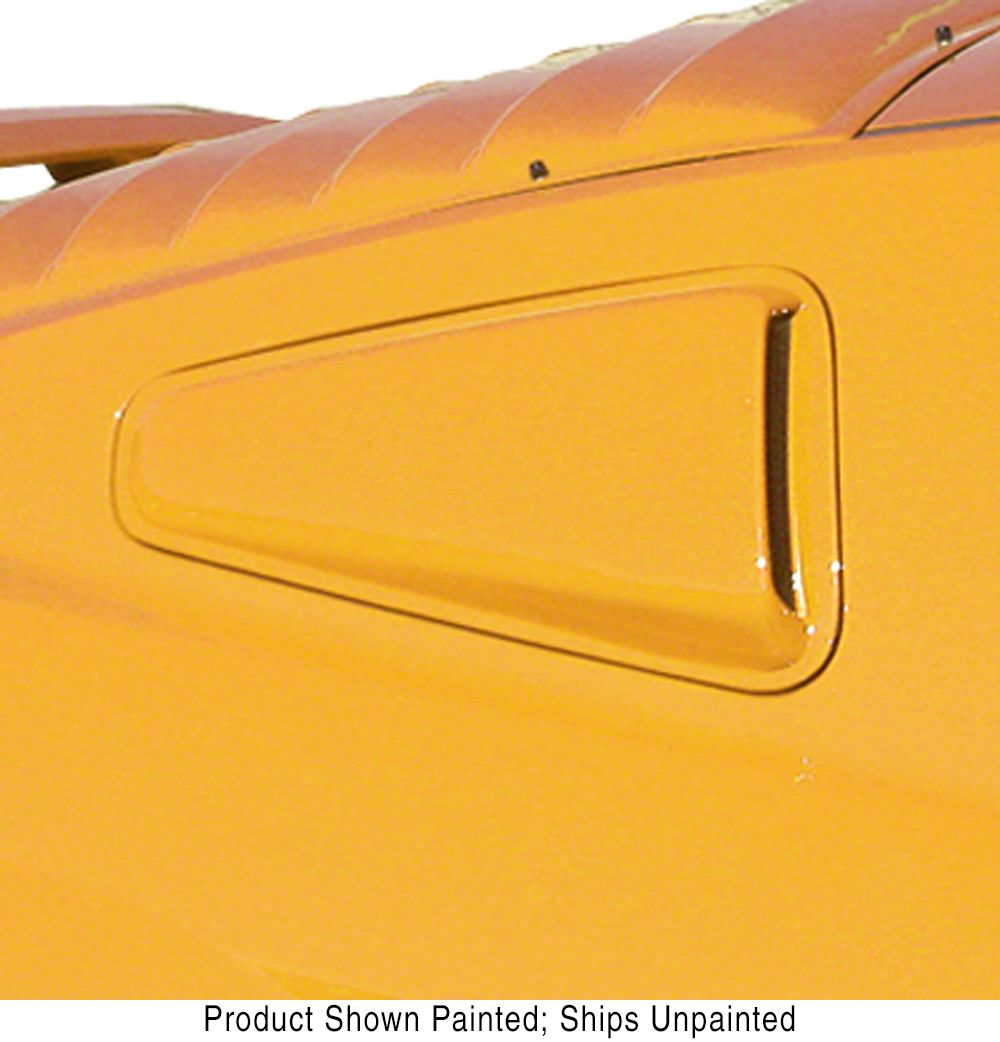 Smooth Surface Side Quarter Window Scoops. Reinvent your Mustang's window styling with the ABS Quarter Window Scoops - Unpainted. These retro-inspired quarter window scoops are custom molded to your windows, providing improved privacy and UV protection without killing visibility. It is easily applied using double-sided automotive 3M tape.