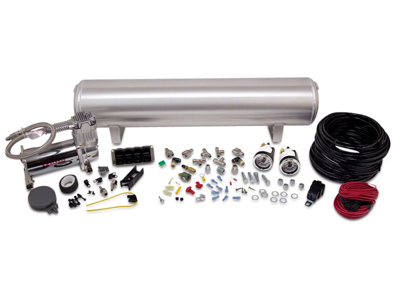 Complete Kit. This Air Lift 4-Way Manual Air Management System comes complete and includes a Viair 380C Compressor, 4 Gallon Raw Aluminum Tank, Air Line, 2 Dual-Needle Pressure Gauges, 4 Paddle Valves, Air Fittings, Air Line Cutter and installation instructions. An attractive stainless steel switch plate bezel is included as well.
