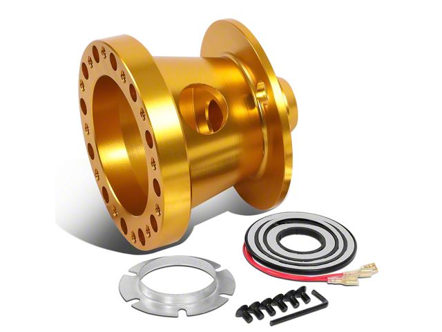 Steering Wheel Powerhouse. Transform your ride with the Aluminum Steering Wheel Hub Adapter; Gold. This steering wheel hub adapter delivers with a solid 1-piece billet aluminum construction and is compatible with 70mm and 74mm 6-bolt pattern steering wheels.