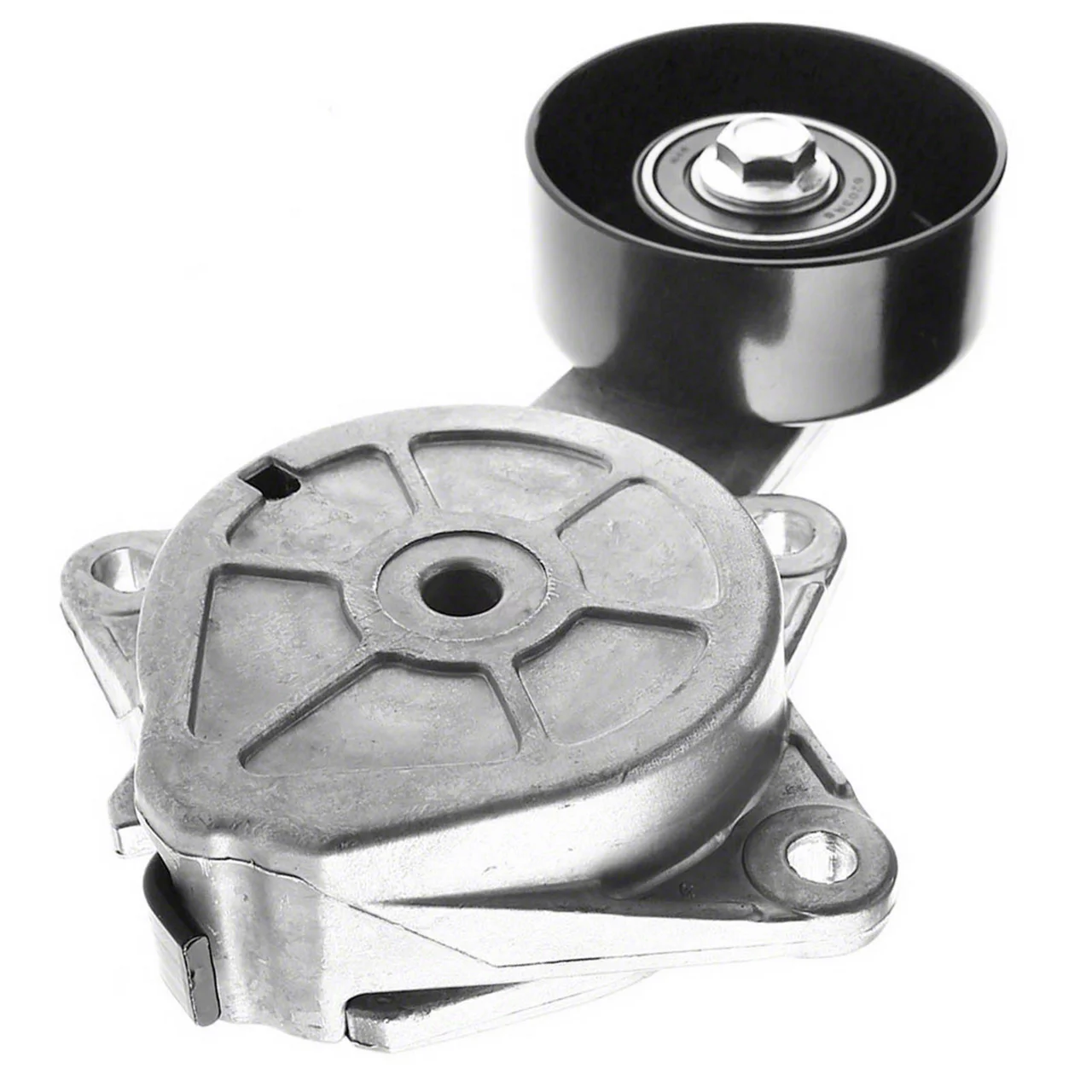 Construction and Appearance. The Belt Tensioner With Pulley is constructed from high-strength steel with a corrosion-resistant coating. The pulley features a smooth, precision-machined surface with a durable bearing designed to withstand high RPM and constant tension. It has a clean, factory-like finish for a professional appearance under the hood.