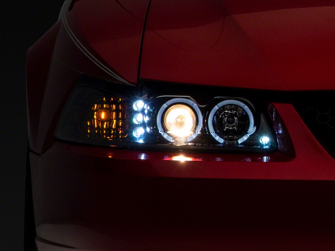 Application. These Dual Halo Projector Headlights; Black are designed to fit 1999-2004 Ford Mustang models. Driver and passenger side lights are included.