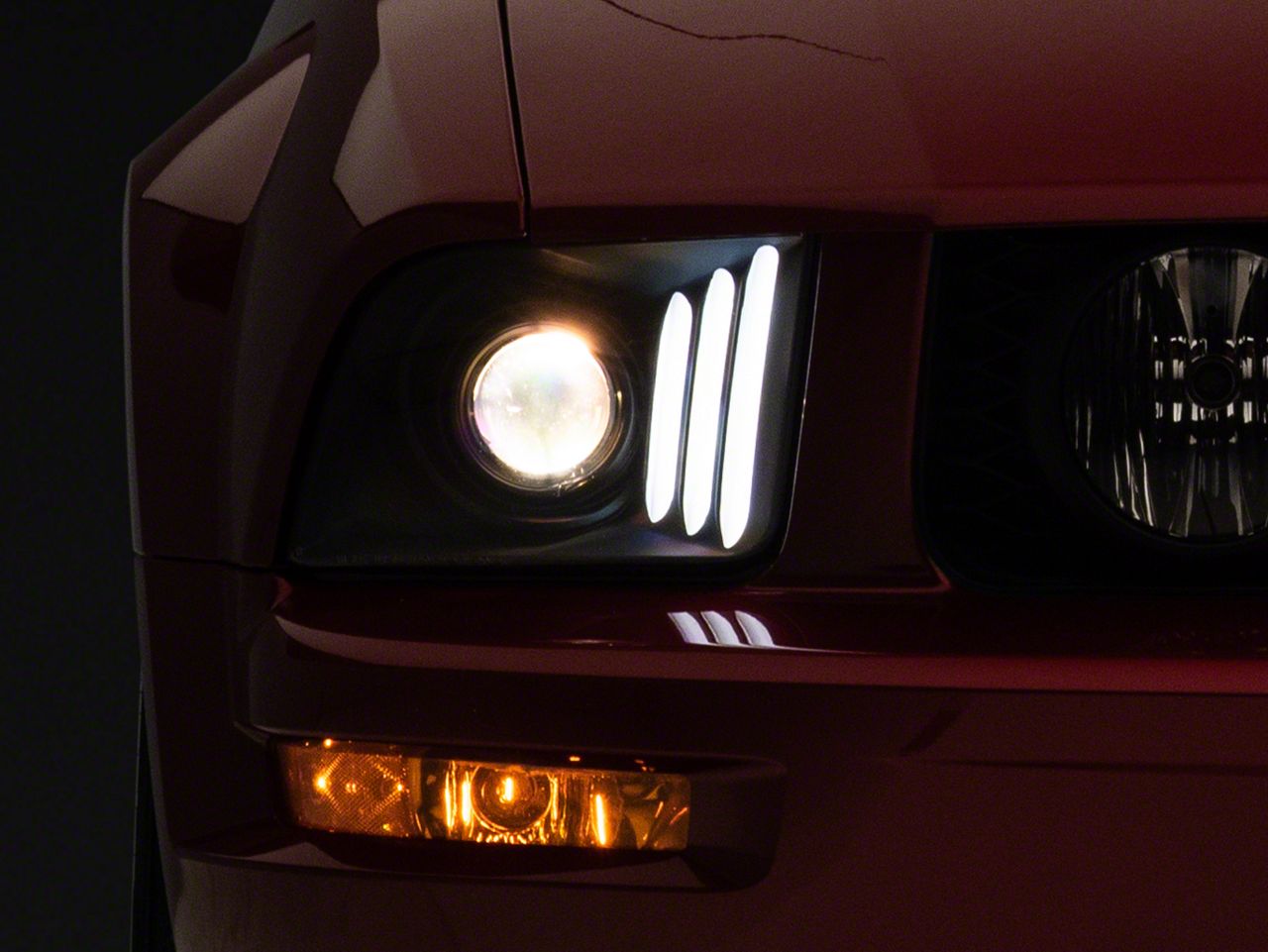 Application. The Black Projector Headlights with Light Bar DRL is manufactured to be a direct fit for all 2005-2009 Ford Mustang GT, V6 models.