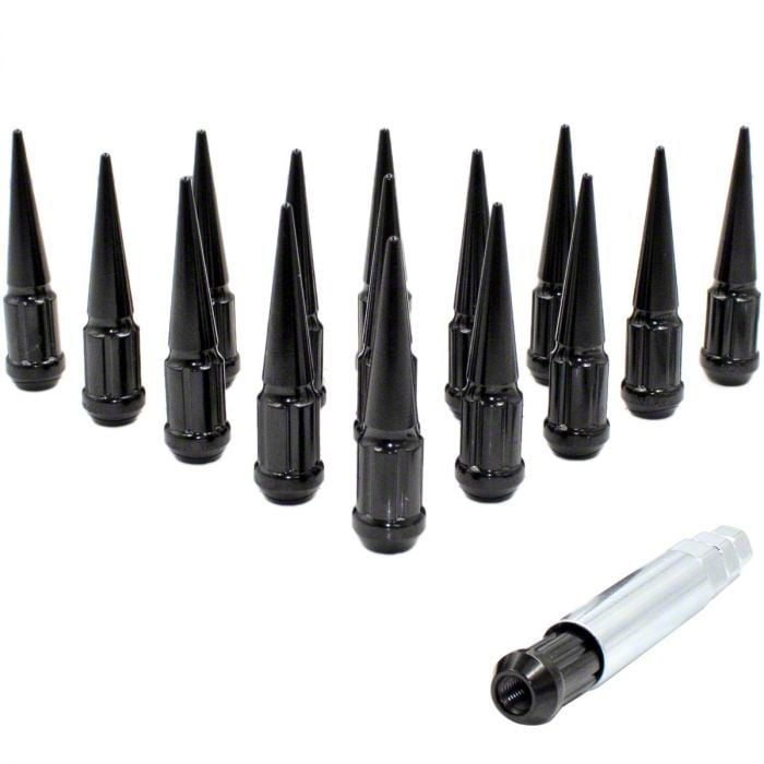 Striking Nuts. This Black Spike Lug Nut Kit is designed with SAE-compliant construction, ensuring a secure fit and reliable performance. Coming in a set of 20, these lug nuts feature a striking black chrome finish that enhances the appearance of your wheels. Built specifically for aftermarket wheels, they are not compatible with factory wheels.