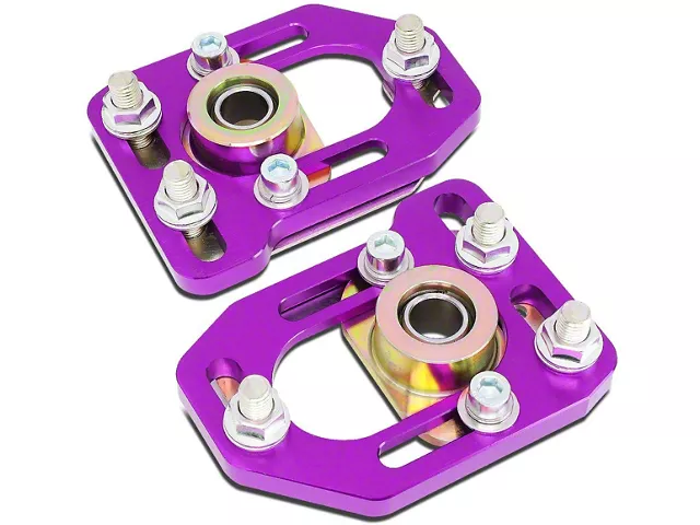 Wide Range of Adjustment. These camber plates allow serious adjustments for even the most drastic suspension adjustment. With the integrated eccentric holes, you can adjust these camber plates for an additional 3-degrees of positive or negative camber and 2-degrees of positive or negative camber, ensuring a proper alignment regardless of your Mustang’s modifications.