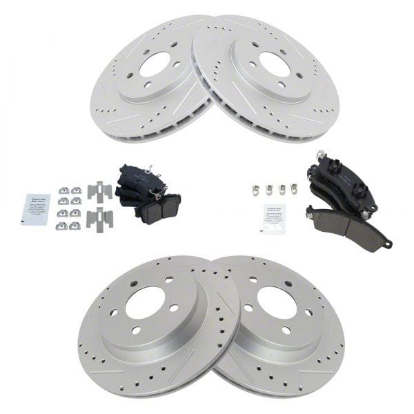 Improved Replacement. Made for the Ford Mustang Cobra, this Ceramic Performance Brake Rotor and Pad Kit comes in a matte black and raw metal finish. Equipped with 4 drilled and slotted rotors and 4 ceramic compound pads, this kit is meant to directly replace your stock brakes. Offering reduced brake fade, a non-interference vane design, and reduced noise and vibration, this is an improved replacement for your stock brakes.