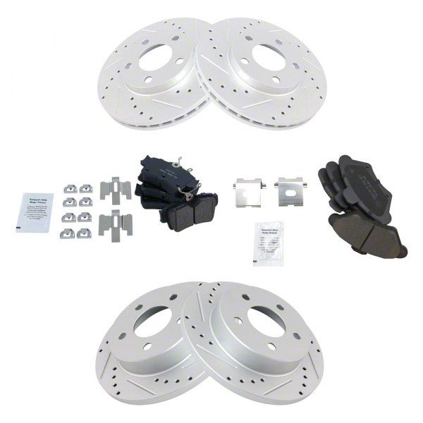 First-Rate Functional Design. The Ceramic Performance Brake Rotor and Pad Kit is a top-quality upgrade designed to enhance the performance and reliability of your vehicle's braking system. The brake rotors and pads are crafted with cast iron, providing exceptional durability and strength. The kit is engineered with ceramic friction material that provides superior stopping power and ensures consistent and reliable performance. The brake rotors feature a premium G-coated finish that enhances their appearance and provides additional protection against extreme conditions. This coating ensures that the brake rotors remain clean and free from rust and corrosion, even in harsh driving conditions. The Ceramic Performance Brake Rotor and Pad Kit is an excellent choice for anyone looking to upgrade their vehicle's braking system. With this kit, you can enjoy improved braking performance, durability, and appearance on the road.