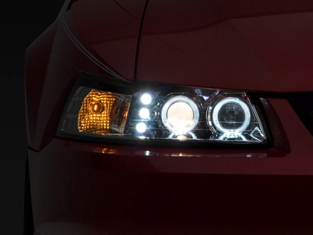 Application. The Chrome LED Halo Projector Headlights with Parking LEDs are manufactured to be a perfect fit for all 1999-2004 Ford Mustang models.