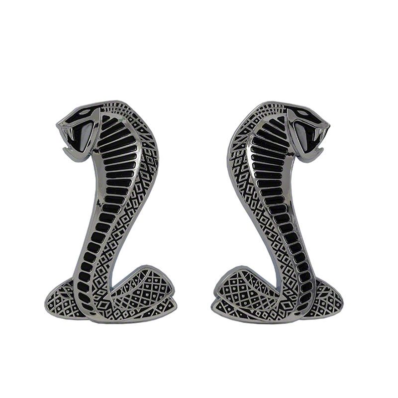 Premium Fender Accent. The Cobra Fender Emblems in Black and Chrome offer an authentic styling detail that enhances the exterior of your Mustang Cobra. These fender badges are designed to replicate the original emblems perfectly, providing a sleek and aggressive look while celebrating the vehicle's heritage.