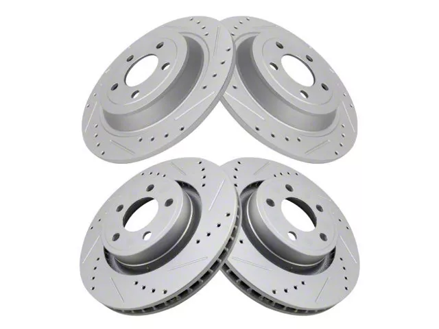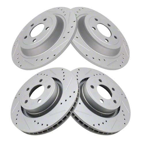 Five Lug Holes. Enhance your Ford Mustang's braking performance with these Drilled and Slotted Rotors. This set includes rotors for both the front and rear positions, ensuring consistent and reliable braking power. Featuring 5-lug holes and a vented rotor type, these drilled and slotted rotors efficiently dissipate heat, reducing the risk of brake fade and improving overall braking performance.