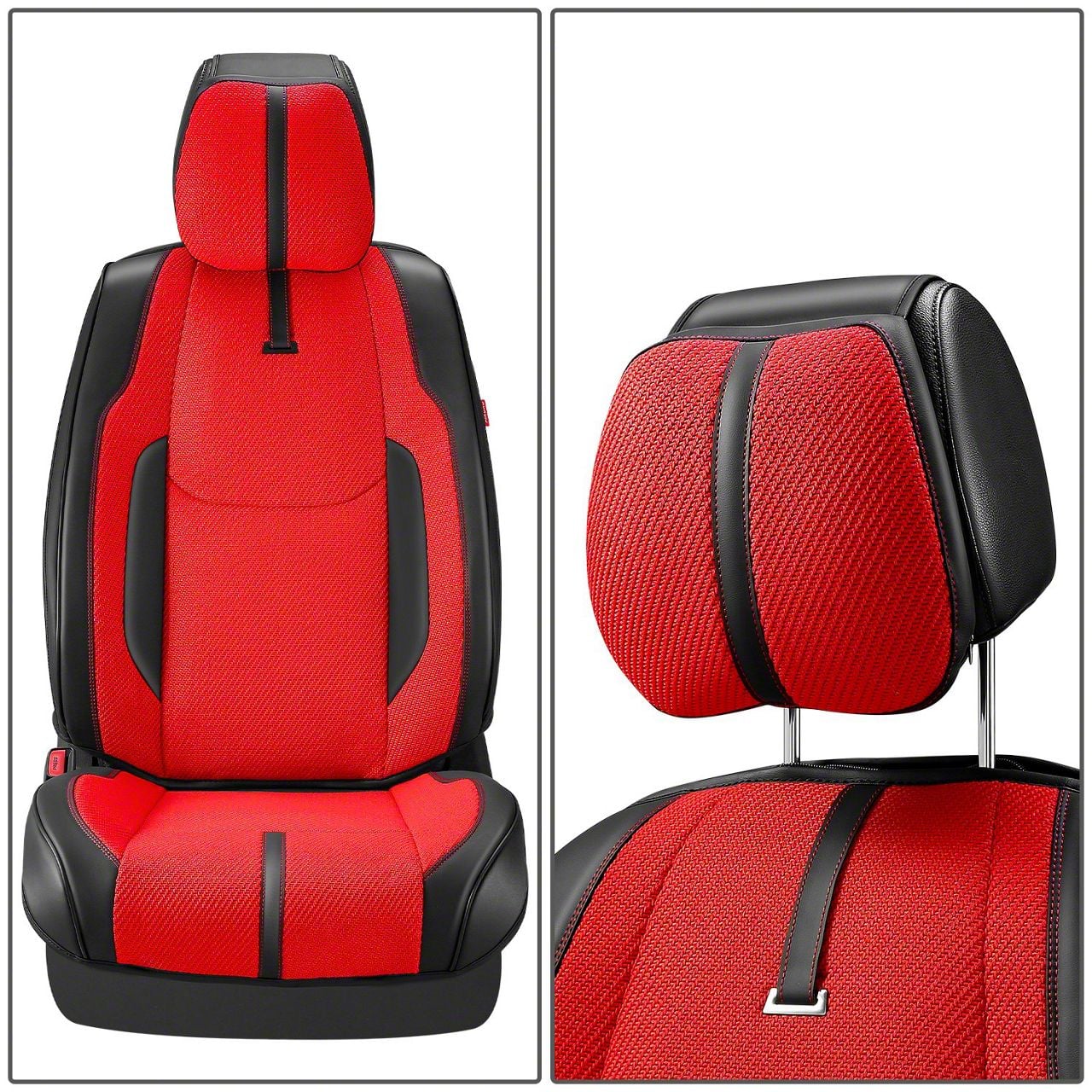 Construction and Appearance. These seat covers combine high quality leatherette with a breathable polyester fabric center that is padded for extra comfort. The rich red and black color scheme is accented with detailed embroidery and stitching, providing a visually striking yet durable finish. Padded headrest covers add cushioned support for added comfort.