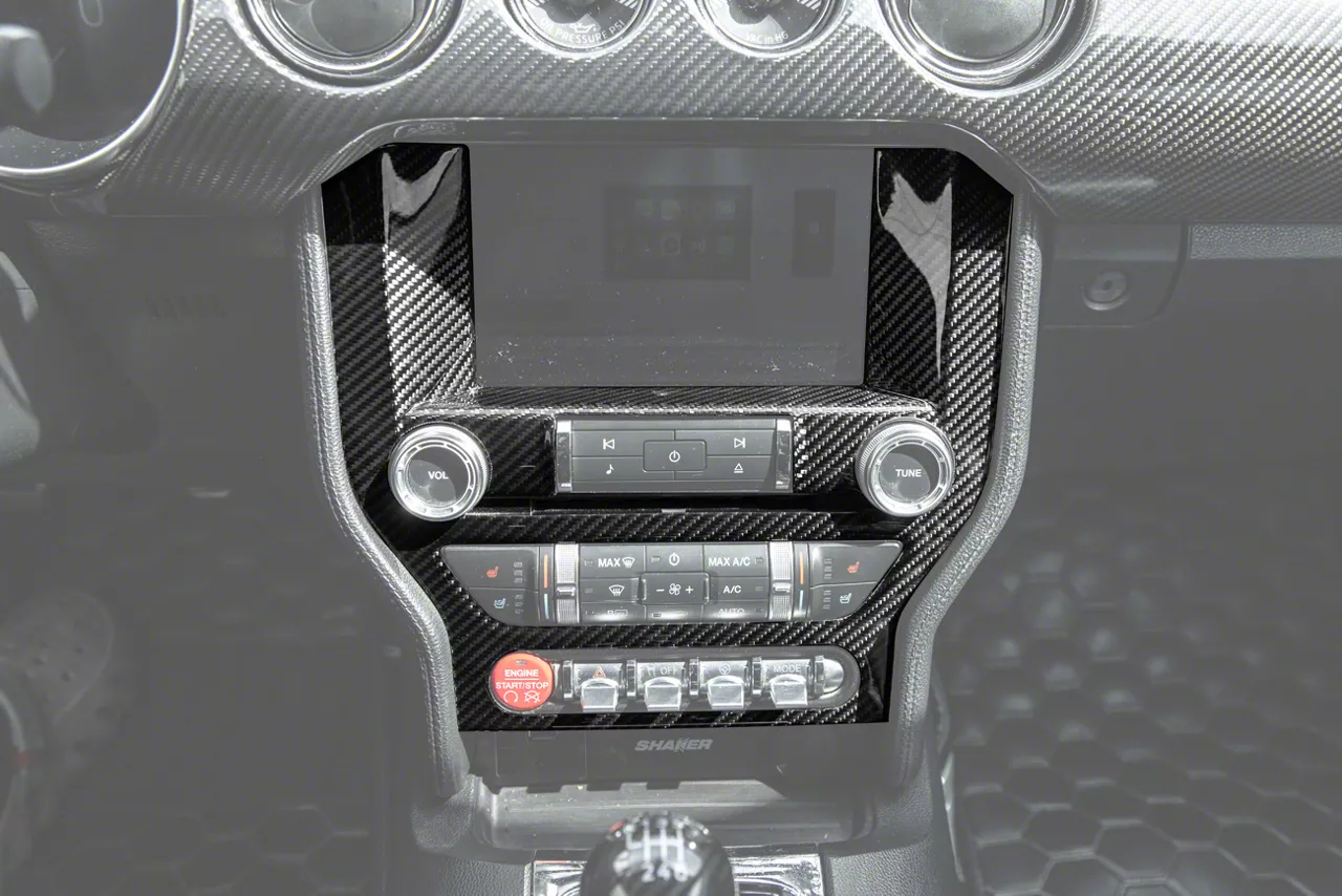 Interior Styling Upgrade. The Factory Style Center Console Trim Cover is a sleek enhancement for your 2015–2023 Mustang’s interior, designed to bring a modern, sporty aesthetic to the infotainment and radio panel area. Featuring a high-end carbon fiber finish, this overlay instantly elevates the cabin’s appearance without altering factory components.