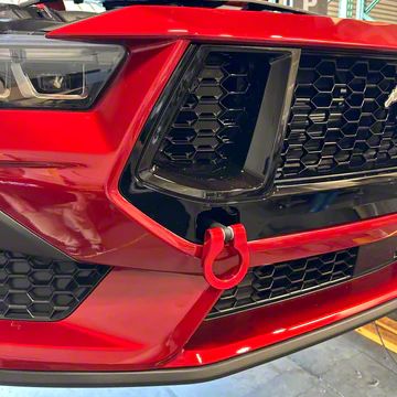 Application. This Feather Lite Stealth Tow Hook with Red D-Ring fits 2024-2026 Mustang GT w/o Performance Pack, EcoBoost.