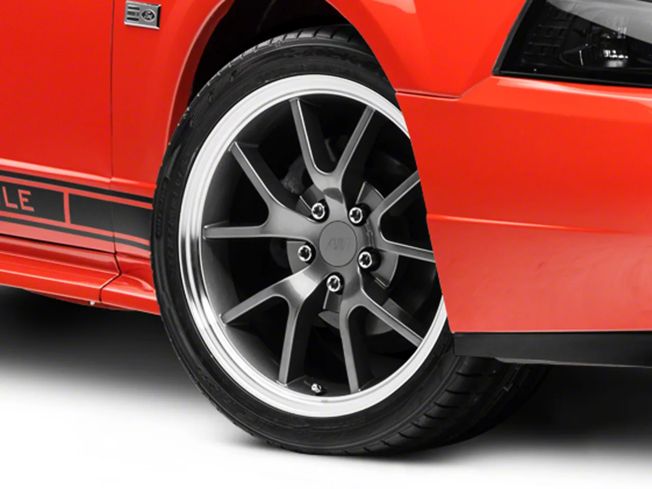 Application. This American Muscle Wheels FR500 Style Anthracite Wheel; 18x9 with a backspace of 6.182 Inch, 157.1mm and bolt pattern of 5 x 114.3mm (5 x 4.5-Inch) ensures impeccable alignment and unmatched driving stability. Specifically designed for 1999-2004 Mustang models, each wheel is sold individually.