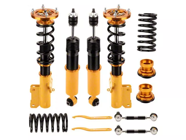 Enhanced Suspension Upgrade. The Coil-Over Kit is designed to deliver superior handling, responsiveness, and ride customization for performance-oriented drivers. With an adjustable drop of 1 to 3 inches in both the front and rear, it allows owners to achieve the ideal stance and improved cornering stability. This kit is specifically engineered to fit 2005-2014 Ford Mustang GT and V6 models, making it a comprehensive solution for drivers looking to refine suspension dynamics.