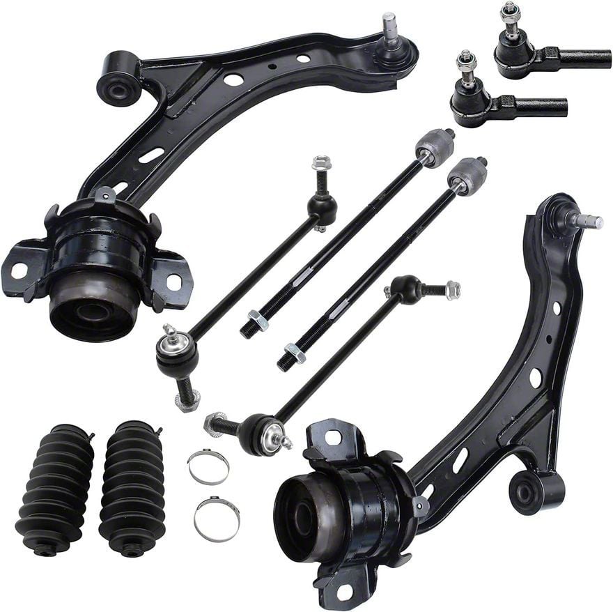 Enhanced Suspension Stability. The Lower Control Arms kit is designed specifically for 2005-2009 Ford Mustang GT and V6 models, providing a direct replacement solution that improves handling and ride stability. This comprehensive kit includes control arms, rack and pinion tie rod boots, sway bar links, and tie rods, ensuring complete front-end suspension support. Engineered for durability and performance, these components help maintain precise steering response and reduce excessive suspension movement.