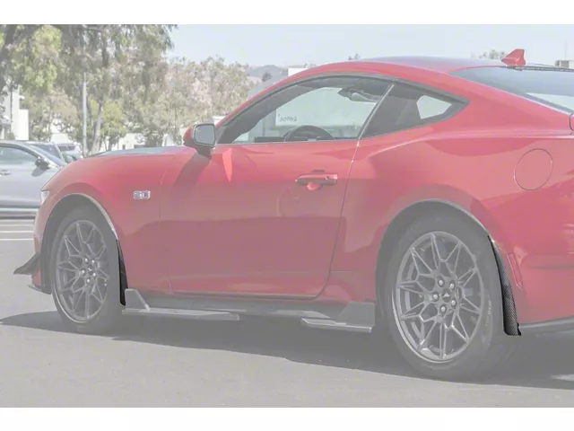 Construction and Appearance. Featuring a high-quality glossy black carbon fiber finish, these splash guards add a premium and aggressive touch to your Mustang. Built for durability, they are engineered to withstand daily driving conditions while complementing the vehicle’s sporty aesthetics.