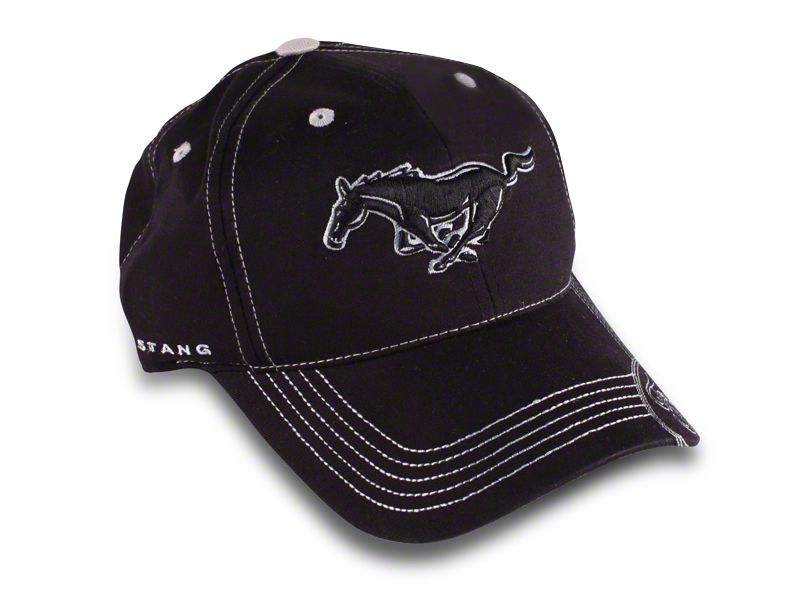 Ford & Pony Logos. This Black Mustang Baseball Hat features a cool 3D embossed and embroidered running pony right on the front with the Ford Logo embroidered on the bill so everyone knows where your loyalties lie.