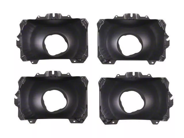 Complete Headlight Bucket Set. The Headlight Bucket Assemblies provide a full replacement solution for deteriorated or damaged headlight buckets, ensuring proper headlight alignment and operation. This kit is essential for restoring the appearance and functionality of the headlights in aging or restored vehicles.