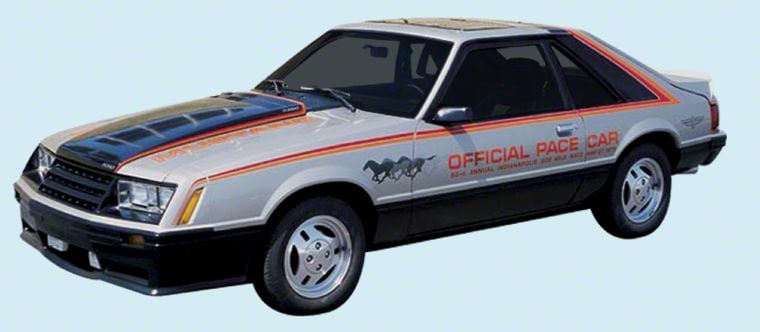 Authentic Pace Car Replica Decals. This Indianapolis 500 Pace Car Stallions Kit brings the classic look of the 1979 Mustang Pace Car to life. The kit includes official replica decals with "Stallions" door graphics for an accurate, vintage appearance, complete with names and bold orange stripes for added flair.