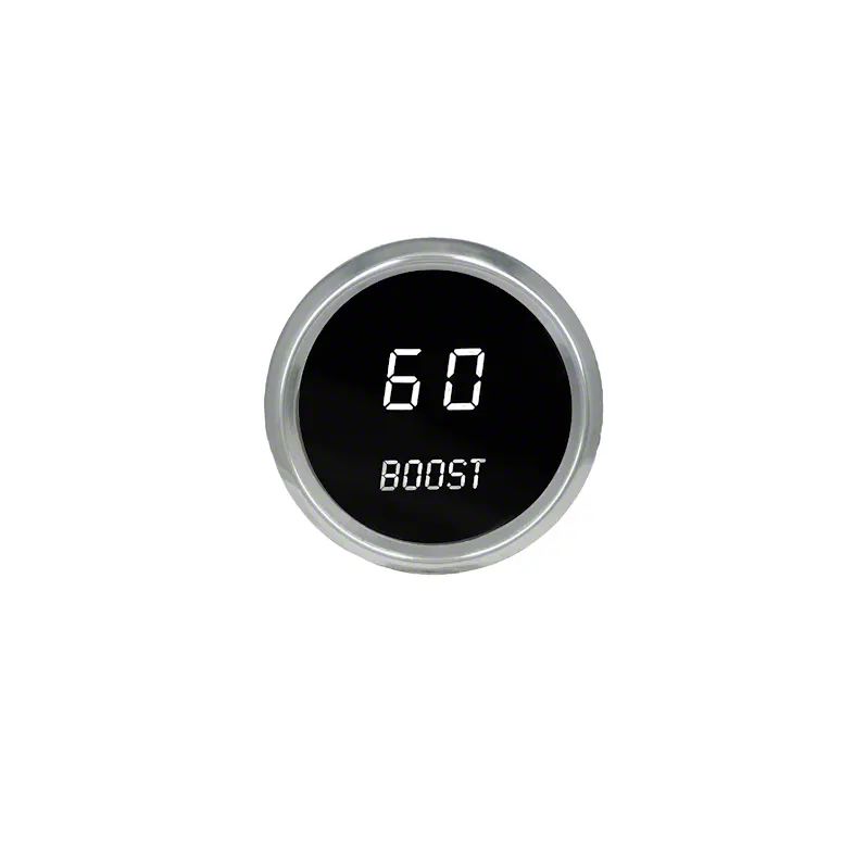 Measure boost pressure accurately with this sleek black-bezel digital boost pressure gauge. It boasts the following features: - Microprocessor controlled with 0 to 60 PSI accuracy;- Compatible with any vehicle;- Easy viewing in sunlight;- Automatic night dimming;- Comes complete with instructions, sending unit, and in-dash mounting hardware;- 2-1/16" diameter and only 1-1/2" deep;- Reads in 1 PSI increments from 0 to 60 PSI; Our digits are 33% larger than any other digital boost gauge on the market, guaranteeing better precision and visibility than you can find with any other manufacturer!