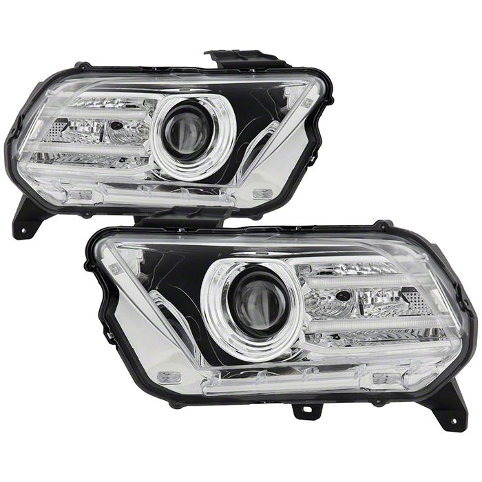Application. This LED DRL Halogen Projector Headlights with Chrome Housing and Clear Lens fits all 2010-2012 Ford Mustang models with Factory Halogen Headlights.