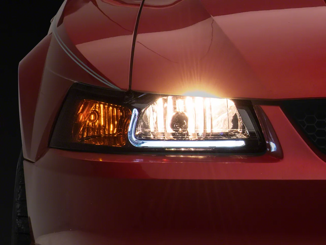 Application. The LED DRL Headlights with Amber Corners; Chrome Housing; Smoked Lens fits 1999-2004 Mustang models.