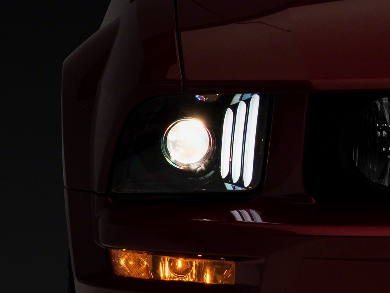 Application. The LED DRL Projector Headlights; Gloss Black Housing; Clear Lens fit all 2005-2009 Ford Mustang GT and V6 models.