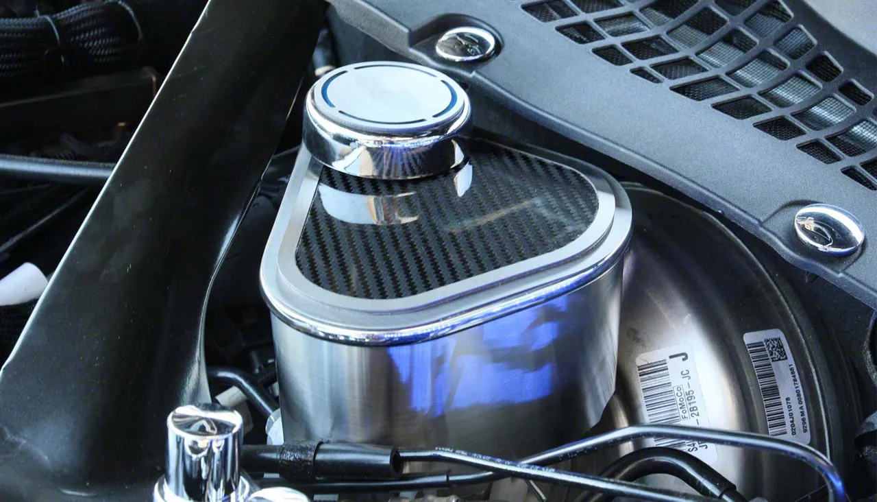 Effortless Upgrade. Elevate the engine bay of your Mustang with the exquisite Master Cylinder Cover, adorned with a Carbon Fiber Top Plate. This premium cover is effortlessly easy to install, requiring no drilling or modification, making it an ideal upgrade for enthusiasts seeking to enhance their vehicle's aesthetics without the hassle. Crafted from 100% stainless steel material, it promises lasting durability and resistance against rust, fade, and tarnish.