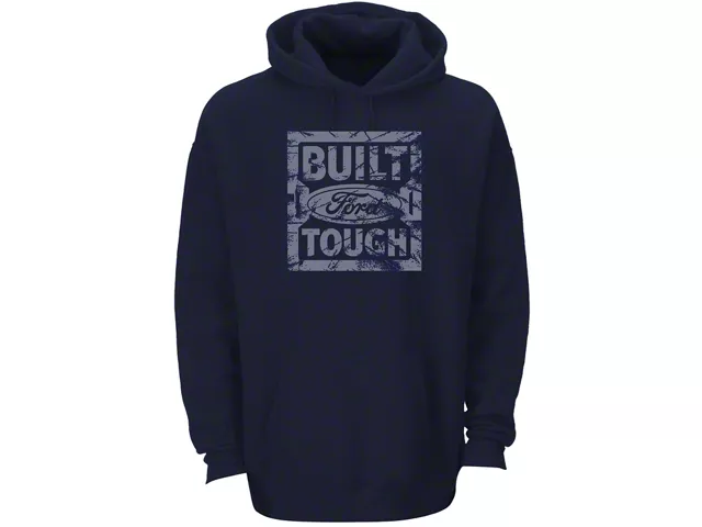 Ford Themed Graphic Hoodie. This great looking navy blue pull over drawstring hoodie is a must have for all Ford enthusiasts. Officially licensed, this graphic hoodie features the distressed Built Ford Tough logo. This Hoodie makes the perfect gift for yourself or the fellow Ford lover in your life.
