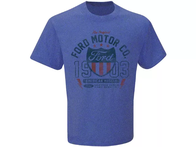Ford Themed Graphic T-Shirt. This great looking blue short sleeve t-shirt is a must have for all Ford enthusiasts. Officially licensed, this graphic tee features the Ford Motor Co.1903 shield design. This T-Shirt makes the perfect gift for yourself or the fellow Ford lover in your life.