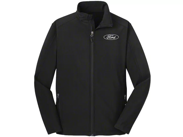 Ford Themed Jacket. This great looking black soft shell zip up jacket is a must have for all Ford enthusiasts. Officially licensed, this jacket features the the Ford Oval logo in white on the left chest. This Jacket makes the perfect gift for yourself or the fellow Ford lover in your life.