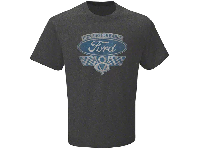 Ford Themed Graphic T-Shirt. This great looking gray short sleeve t-shirt is a must have for all Ford enthusiasts. Officially licensed, this graphic tee features the High Performance Ford V8 checkered flag design. This T-Shirt makes the perfect gift for yourself or the fellow Ford lover in your life.