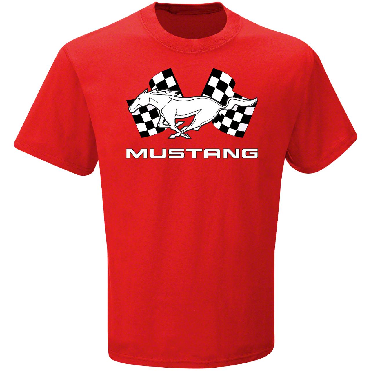 Mustang Graphic T-Shirt. This great looking red short sleeve t-shirt is a must have for all Ford enthusiasts. Officially licensed, this graphic tee features the Running Pony logo over a pair of crossed checkered flags. This T-Shirt makes the perfect gift for yourself or the fellow Mustang lover in your life.