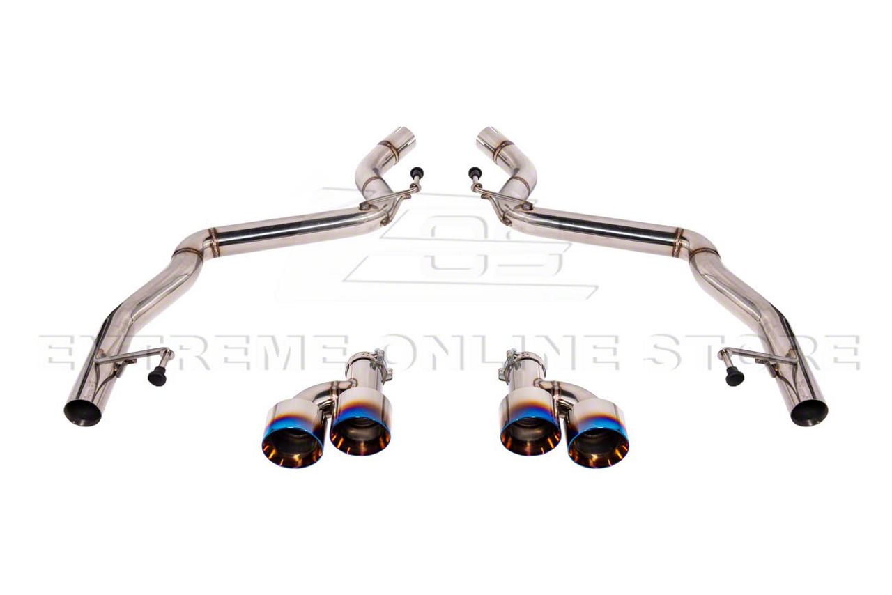 Construction and Appearance. This system is built from 2.5-inch T-304 stainless steel tubing for lasting durability and corrosion resistance. It features four dual-walled 3-inch exhaust tips in a polished chrome and burnt finish, adding a high-performance look to the vehicle’s rear. The precision-crafted tubing and smooth bends ensure optimal airflow while making a bold visual statement.
