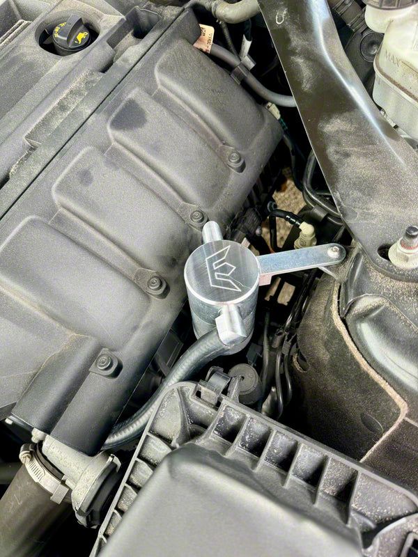 Billet Oil Catch Can. The Oil Catch Can with Strut Tower Mount; Satin / Uncoated is designed to capture blow-by oil vapors before they reach the intake manifold, preserving engine timing and maintaining peak power. It is an essential upgrade for maintaining a cleaner intake system and enhancing engine performance in high-demand applications.