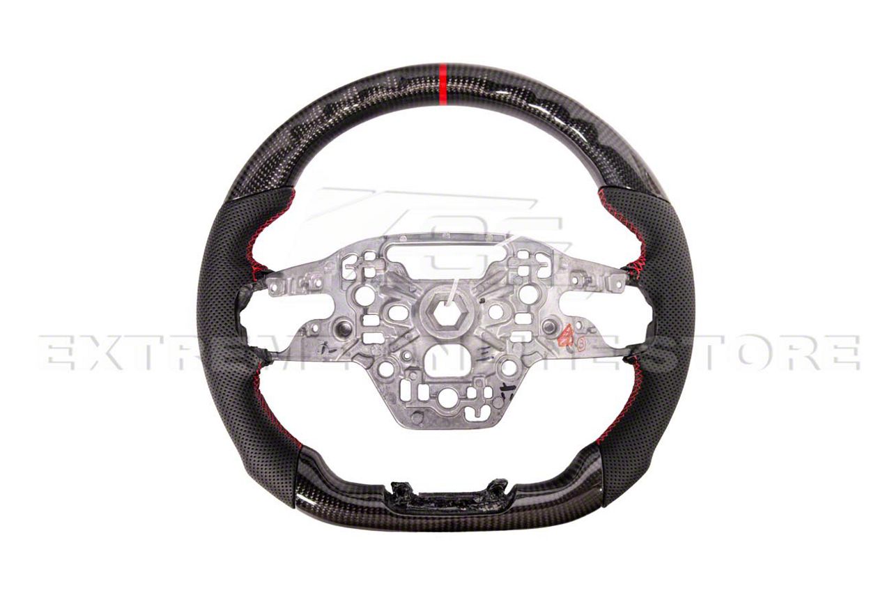 Construction and Appearance. Built from premium carbon fiber, this steering wheel is lightweight yet exceptionally strong. The ergonomic hand grips are wrapped in perforated leather to provide superior comfort and grip. The high-gloss finish showcases the carbon fiber weave, while the red stripe serves both as a visual accent and a functional center marker for track-inspired driving.