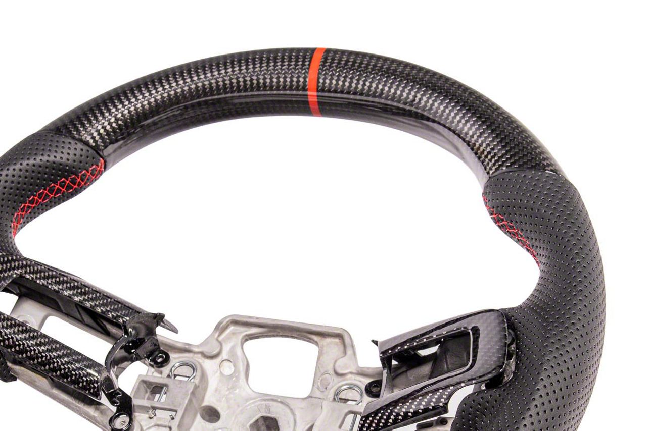 Application. This Perforated Leather Steering Wheel with Button Covers; Carbon Fiber with Red Stripe is designed to fit 2015-2017 Ford Mustang models.