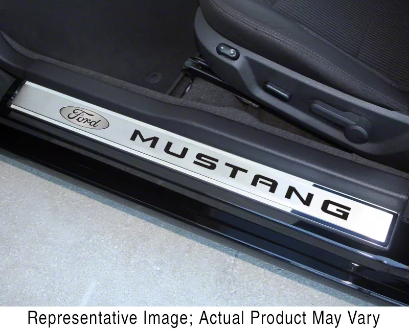 Application. The Polished/Brushed Door Sill Plates with Ford Oval and Mustang Logos; Black Carbon Fiber are engineered to be a direct fit for all 2010-2014 Ford Mustang models.