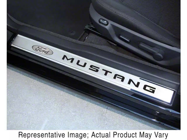 Door Sill Covers by ACC. Show your Mustang pride to the fullest with the Polished/Brushed Door Sill Plates with Ford Oval and Mustang Logos; Brushed Black. These polished door sills are adorned with the cursive Ford and Mustang logo for a bit of aggressive styling.
